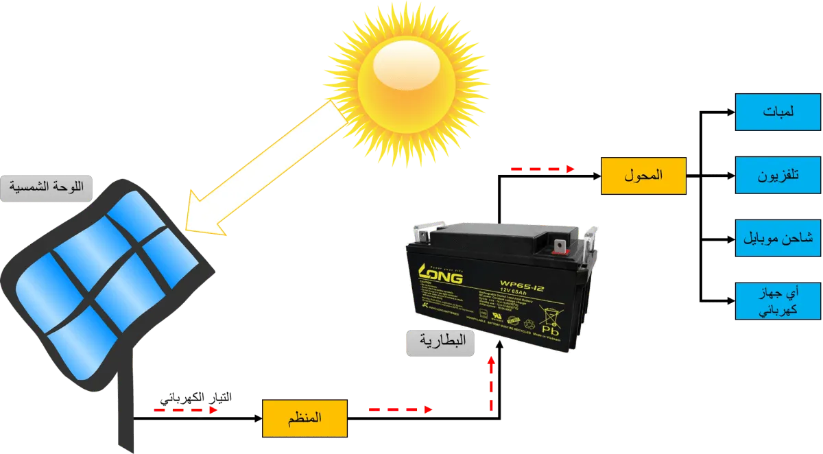 الشمس لا تسطع دائما و لذلك، نحتاج لوسيلة لحفظ الطاقة الكهربائية للاستفادة منها ليلا. البطاريات المستعملة في أنظمة الطاقة الشمسية ليست مثل بطاريات السيارات! عادة ما تكون مصممة لتخزين الشحنة الكهربائية لفترة أطول (deep cycle battery). بعد البطارية يأتي المحول الذي يحول الكهرباء من التيار المباشر إلى التيار الترددي (ac electricity). أغلب الأجهزة الكهربائية المنزلية تستعمل التيار الترددي (220V) و لذلك نحتاج للمحول.